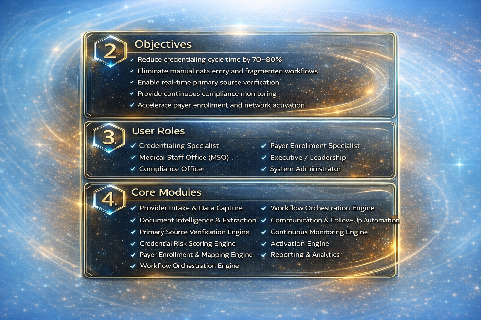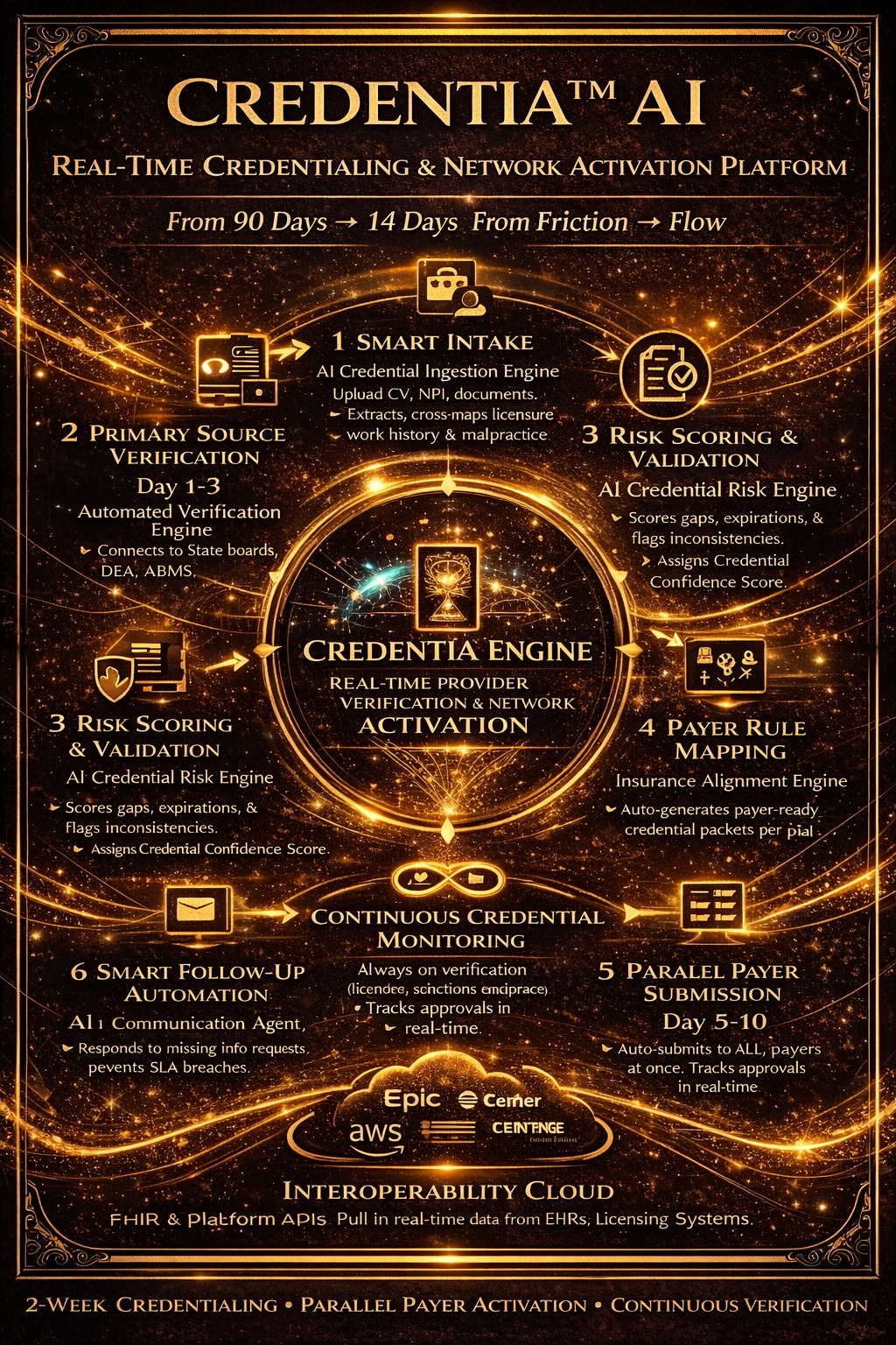 What sets CREDENTIA™ AI apart is not just speed—it’s orchestration. We unify credentialing, payer enrollment, compliance, and activation into one seamless system, enabling health systems, payers, and medical groups to operate with unprecedented efficiency and precision.